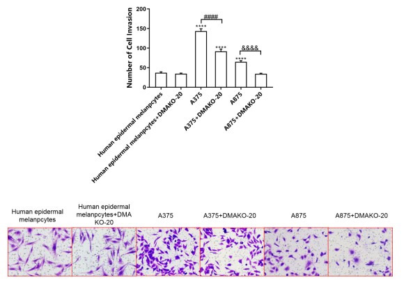 清洗掉多余的染料,在显微镜下观察并计数侵袭到膜下表面的细胞。
